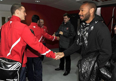 | Henry (right) shakes hands with Arsenal players before a match. |
